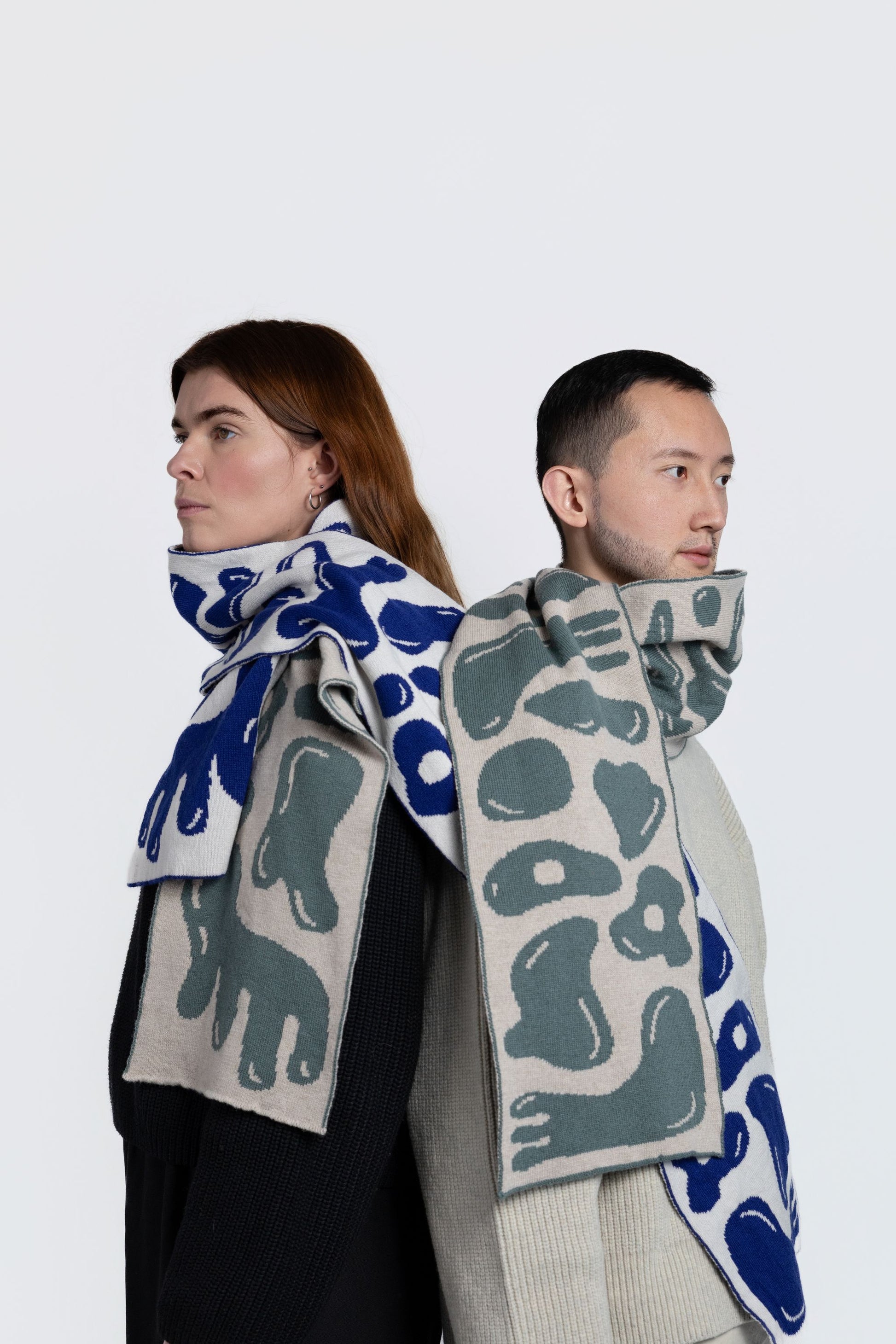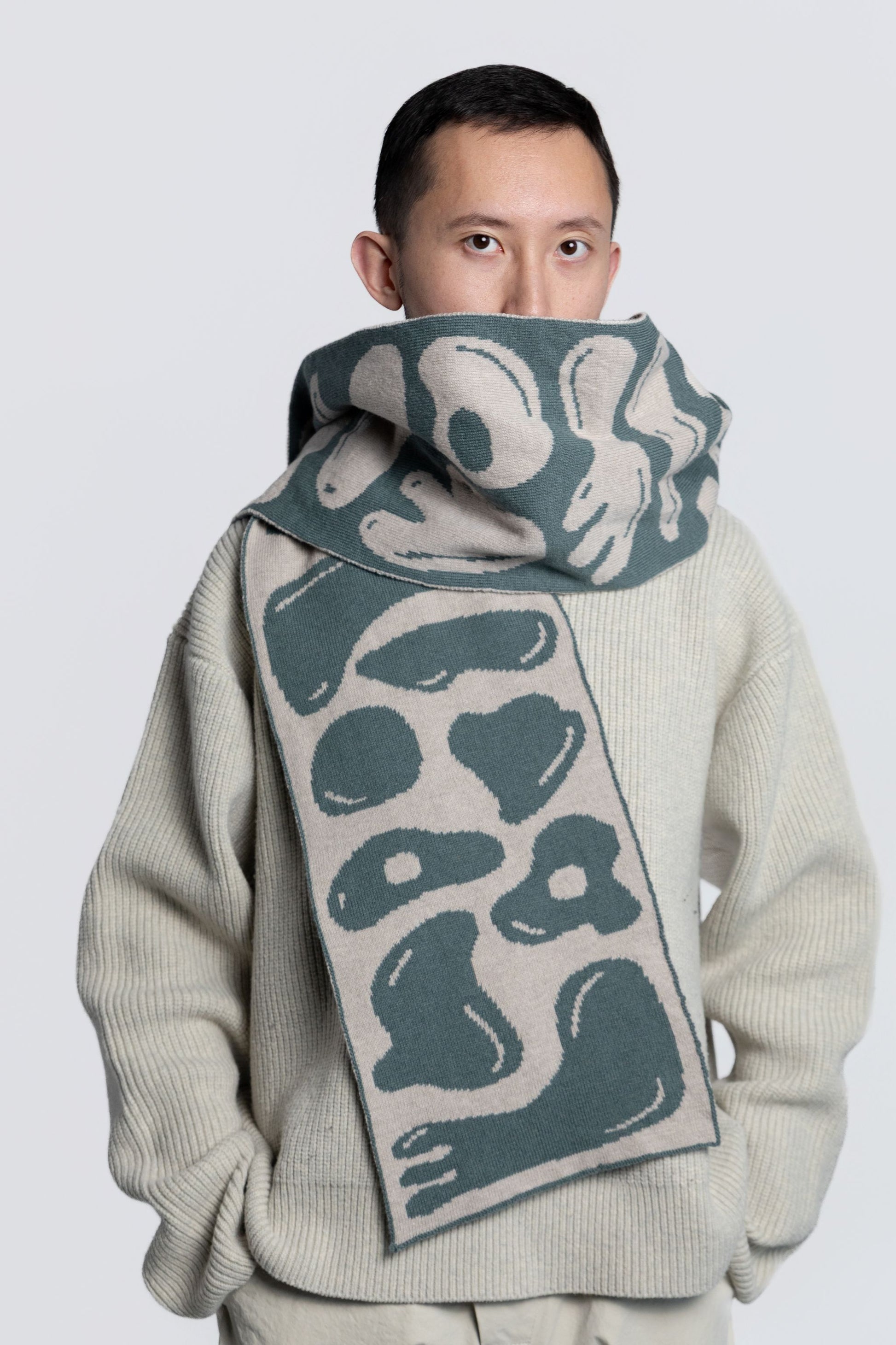 The Partially whole scarf is covered in floating pieces that resemble someone or something, each piece is not necessarily part of anything but still when pieced together they are whole.