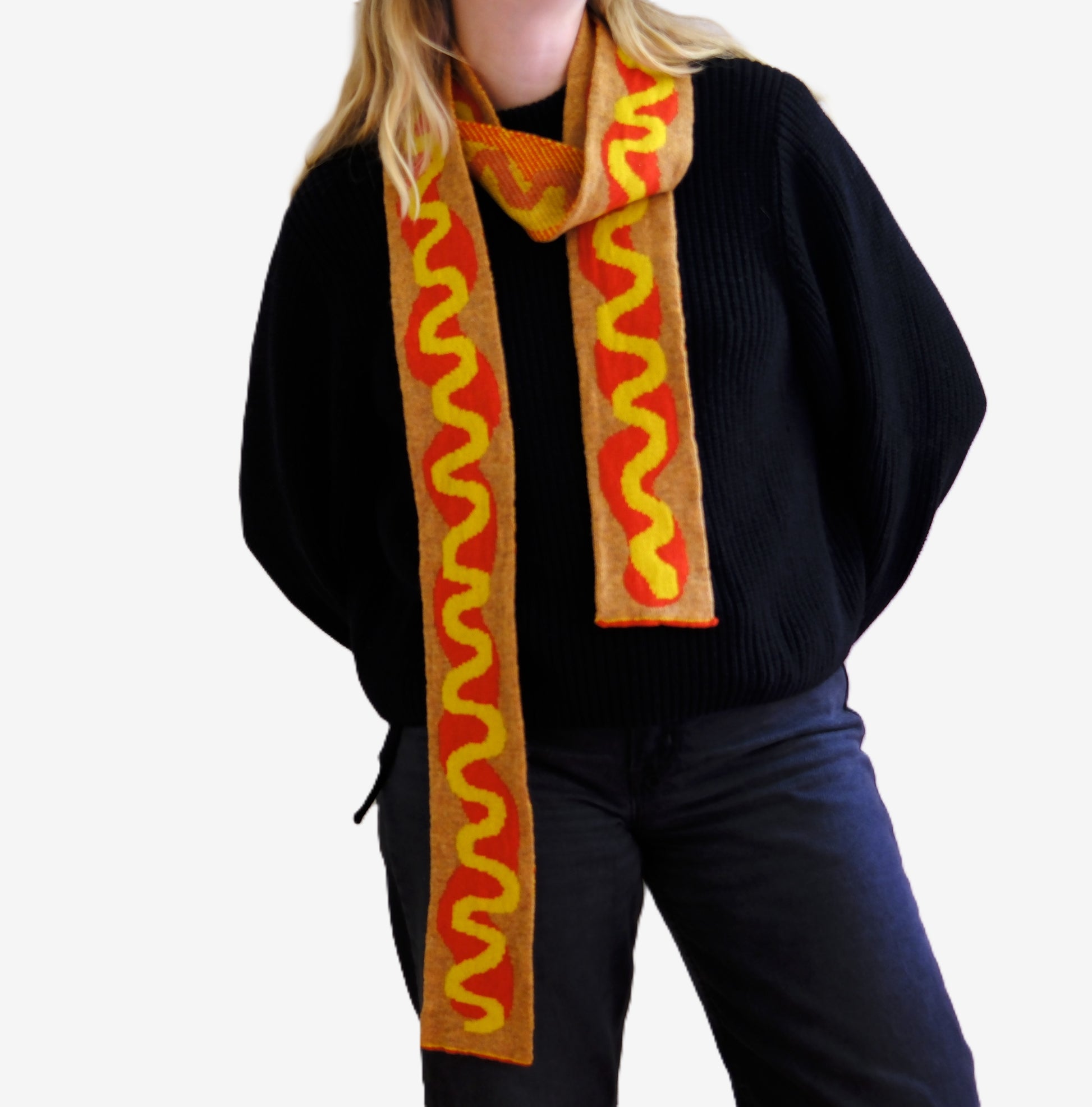 If you spill sauce or other hot-dog toppings on the scarf make sure to handwash in lukewarm water, or on a wool-program (not higher than 40°C). Do not tumble dry.