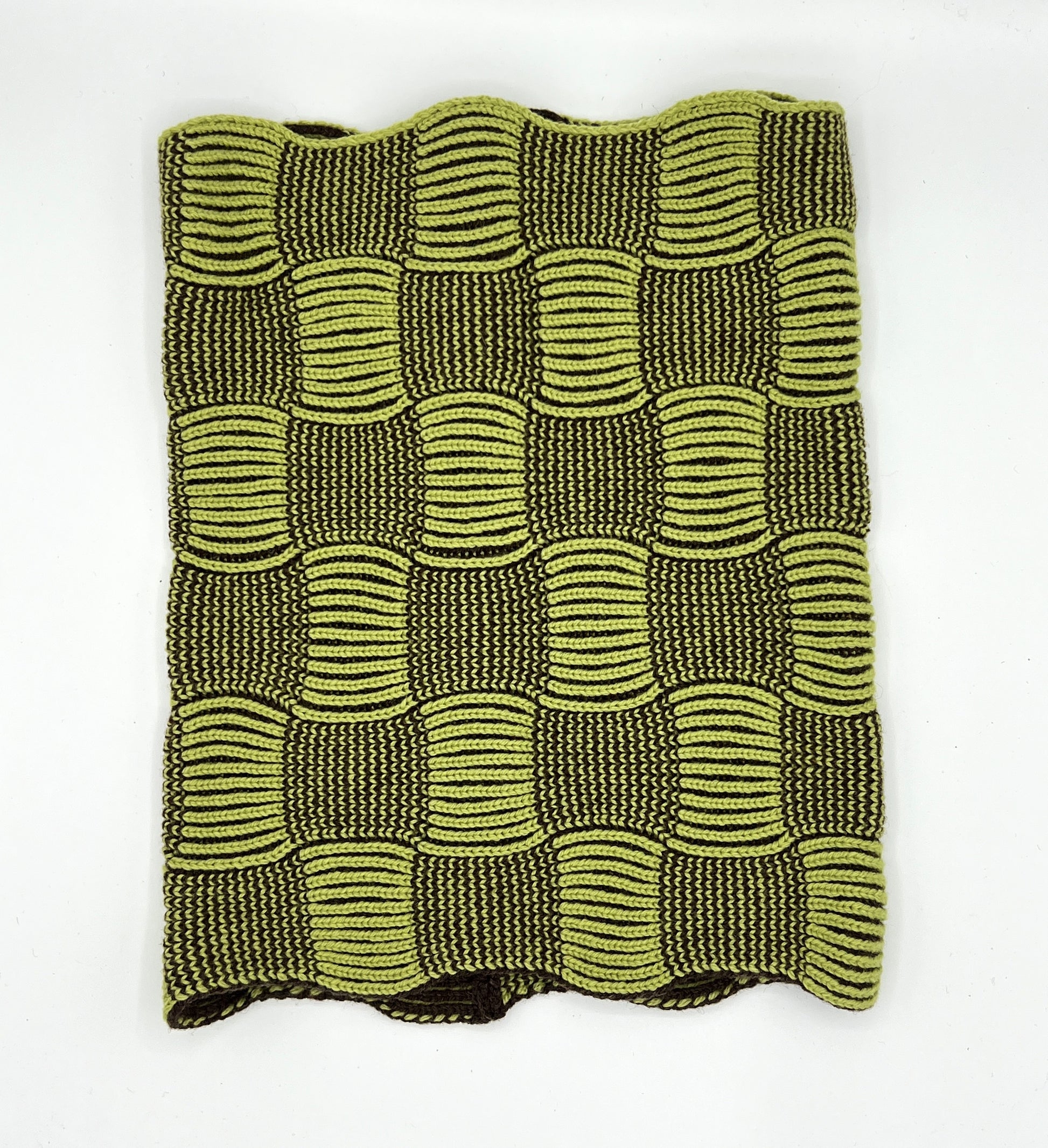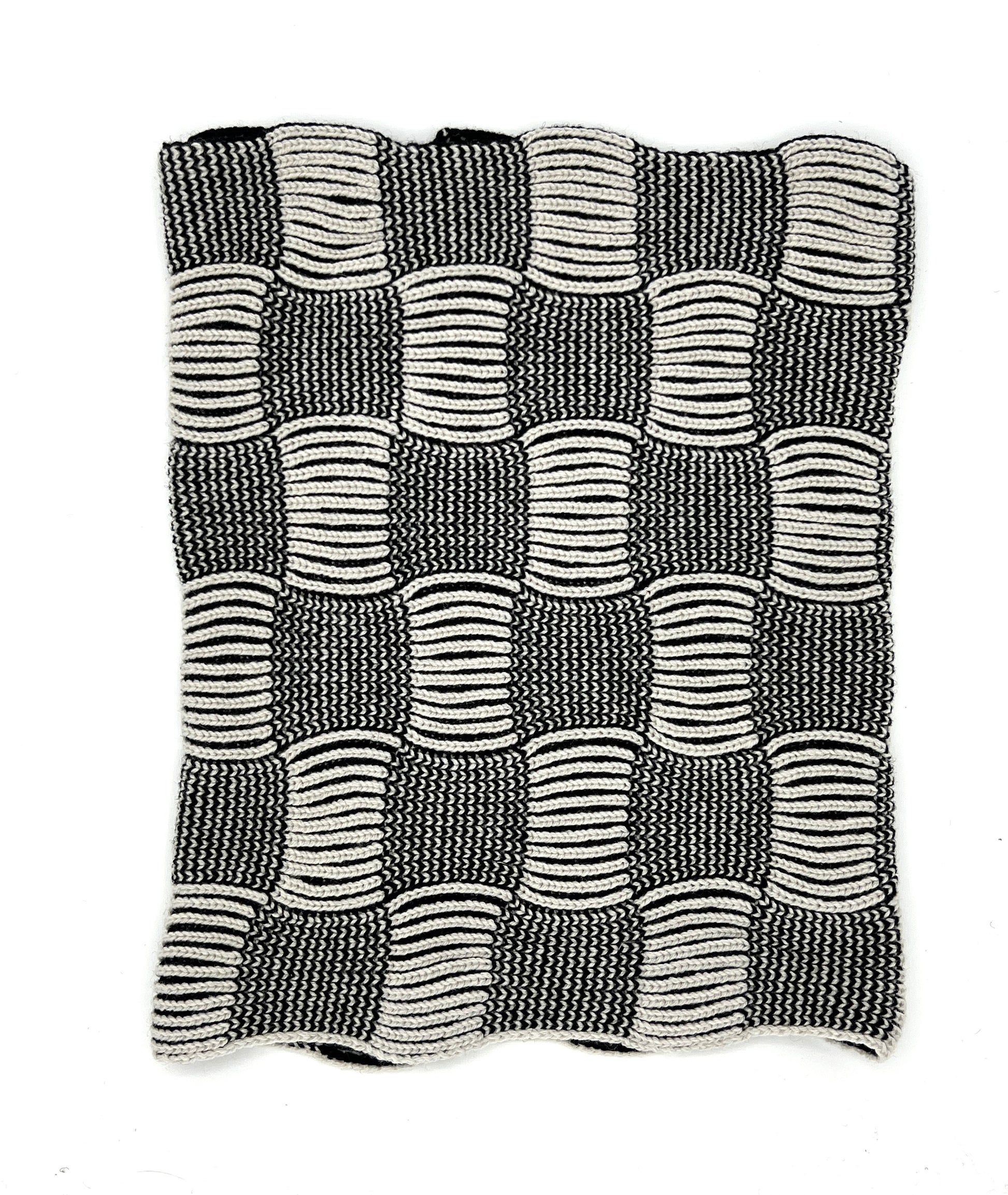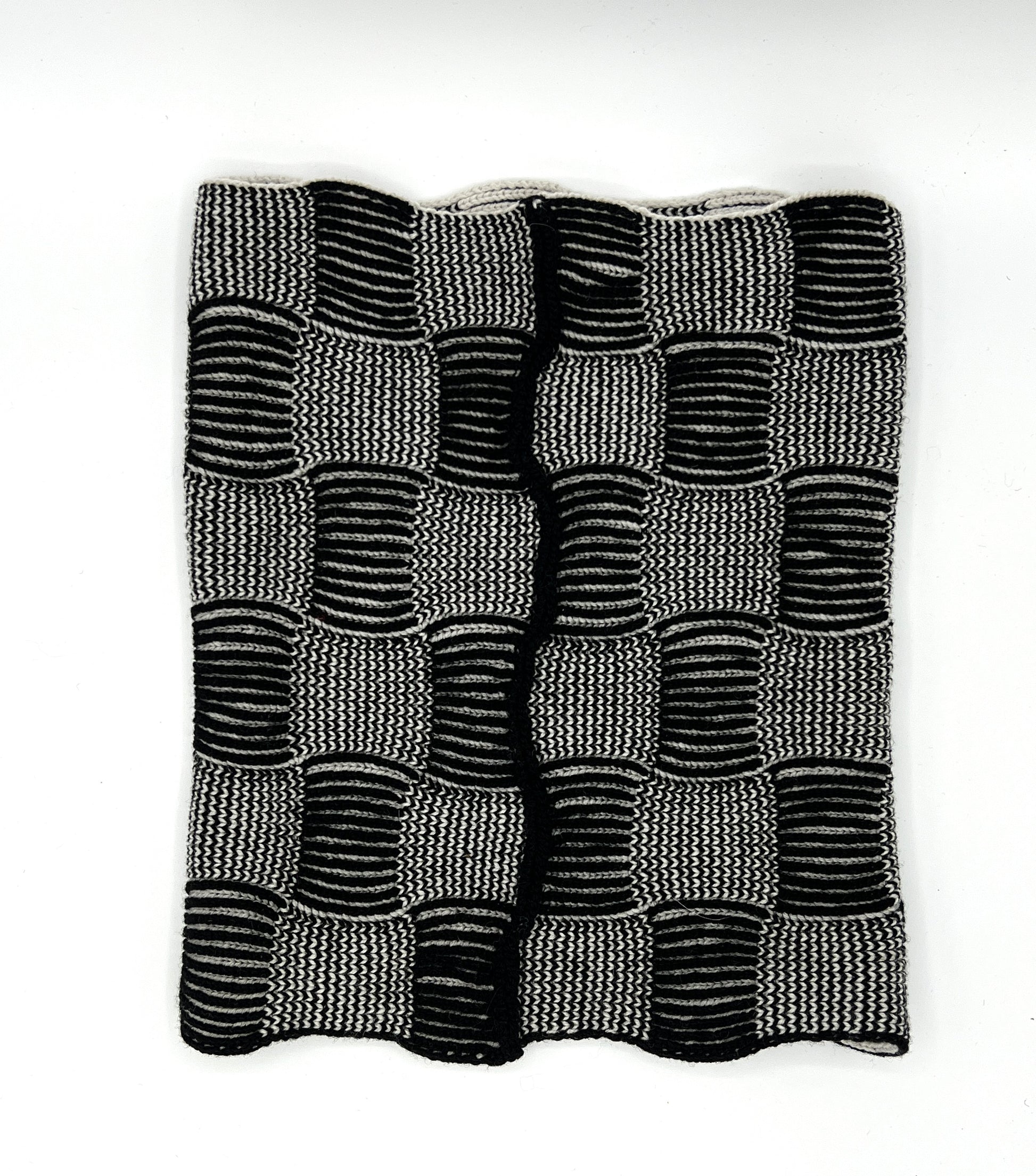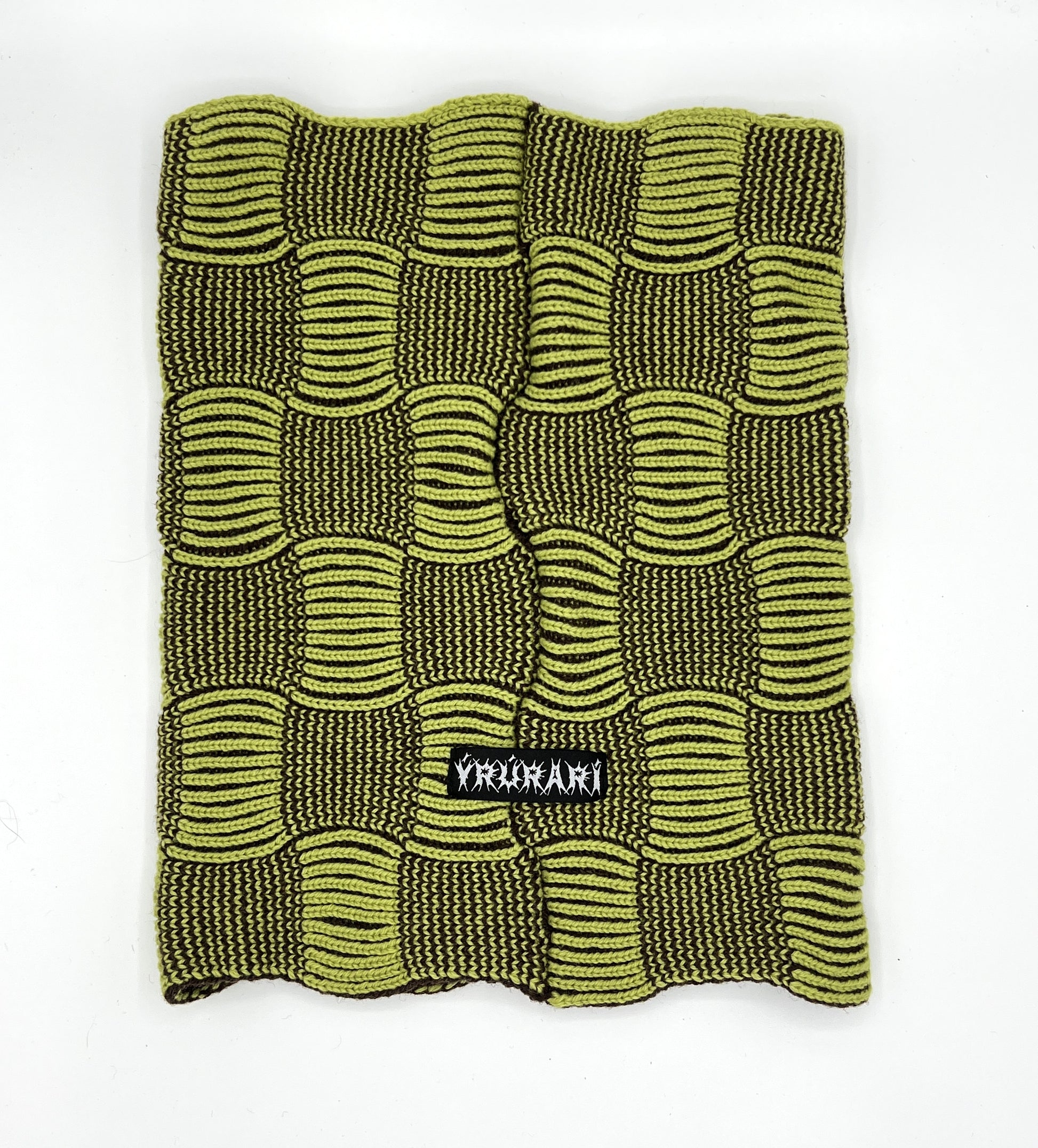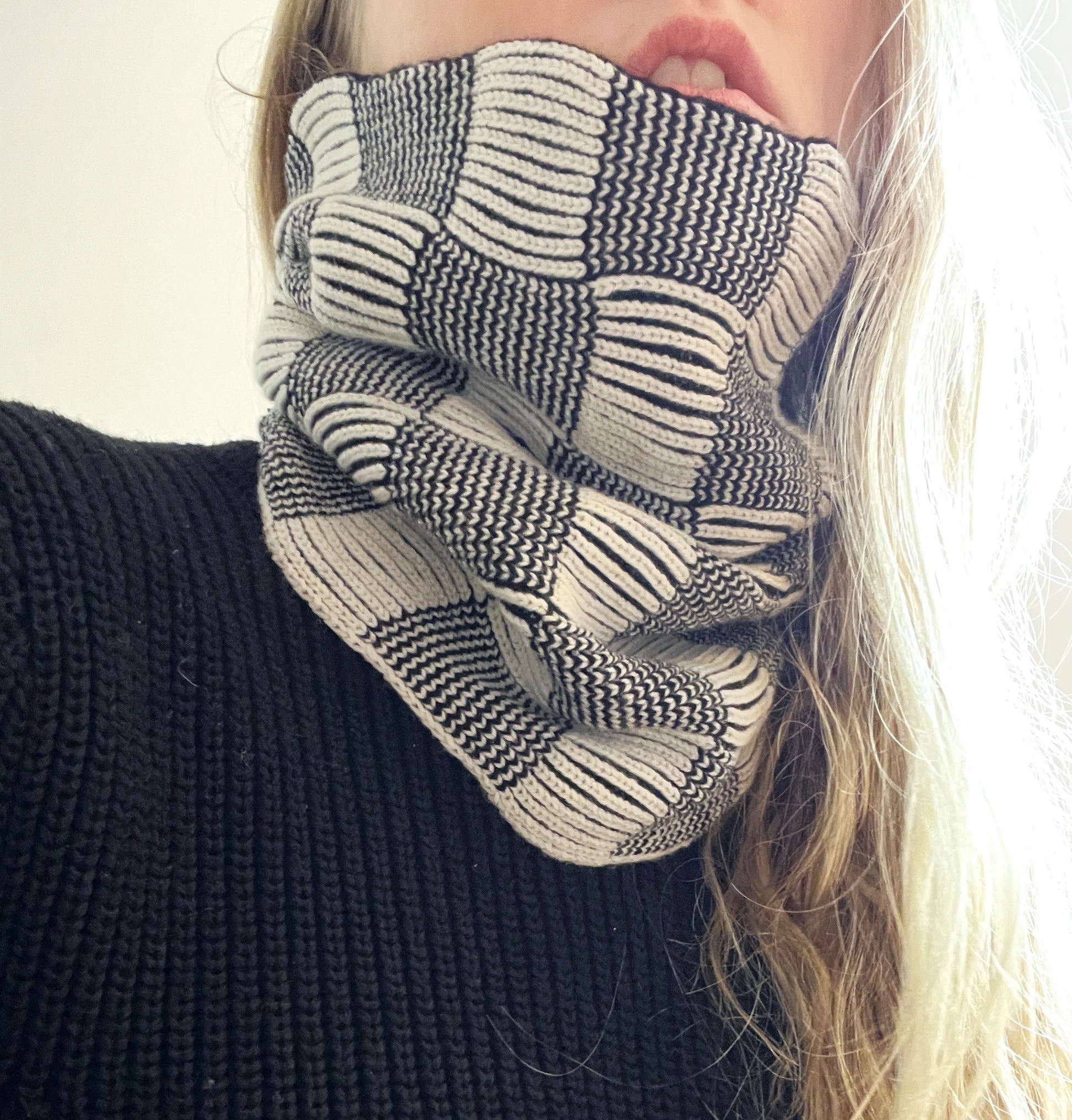 The snood was designed from knitted sketches made in the process of the exhibition “Prótótýpa I” for DesignMarch in Reykjavík 2025. The process was built around experimentations on my new digital knitting machine evolving into this mesmerizing checkered pattern to repeat again and again around the neck. It is possible to turn the snood inside out to change up the color mix for special occasions.