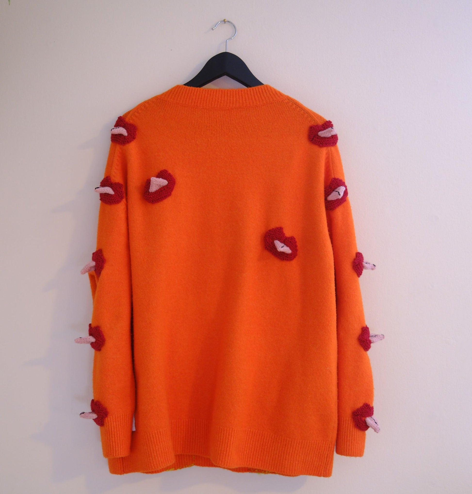 One-off upcycled sweater, base sweater is acrylic and wool mix, hand made decorations knitted and embroidered with wool and leftover yarns. Created by Ýr.