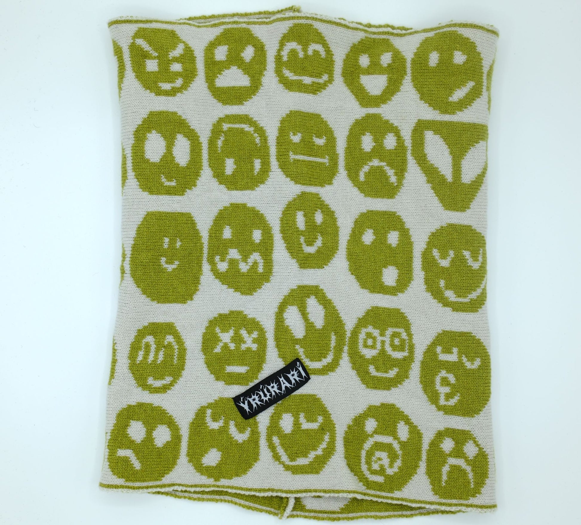 Snood filled with range off emotions, each one unique. This snood doesn't only keep you warm on cold days, it can also be used to translate feelings if you don't feel like expressing them on your own , just point at an emotion that resembles how you feel when you are asked how you are doing.